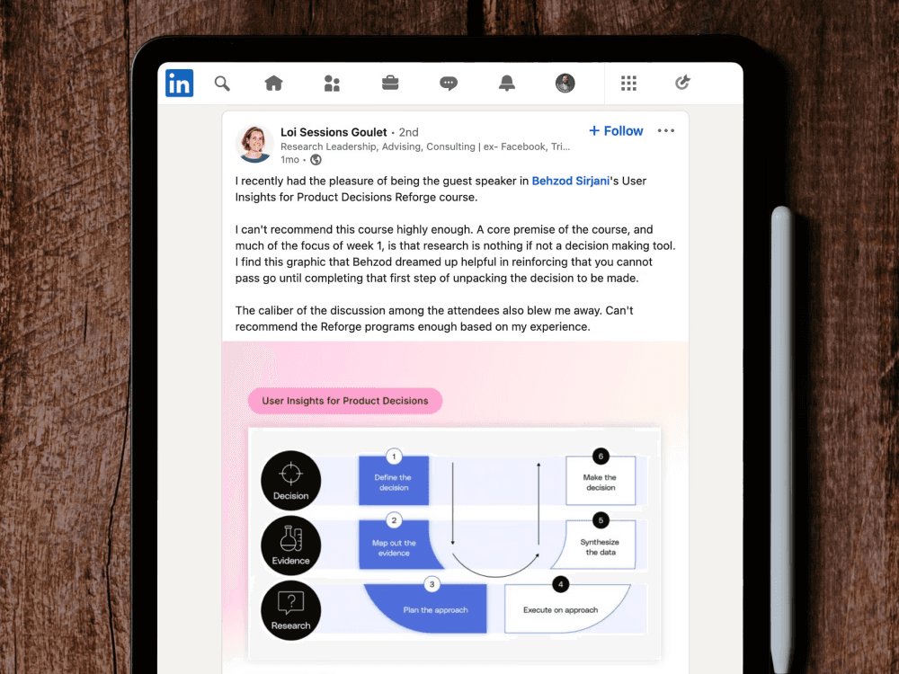 The heart of Reforge Learning is its seasonal cohorts when new courses are launched. I've built on 7 intensive programs, and designed 2 exclusively. From 2022 to 2024, the process of program creation is a highly collaborative one, involving SMEs, Strategy Leads (who distill insights), Content Strategists (who translate insights into plain language), and Visual Designers (who craft visuals to bring insights to life—that was me). Since 2024, the process became streamlined where I now work directly with SMEs, script the content, design learning visuals solo and in collaboration with contractors, and I then curate the generation of AI voice overs trained on the course's SME and edit together the final course videos.